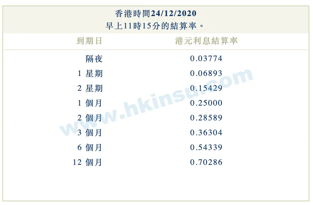 2020年12月24日香港银行港元拆借利率(hibor)